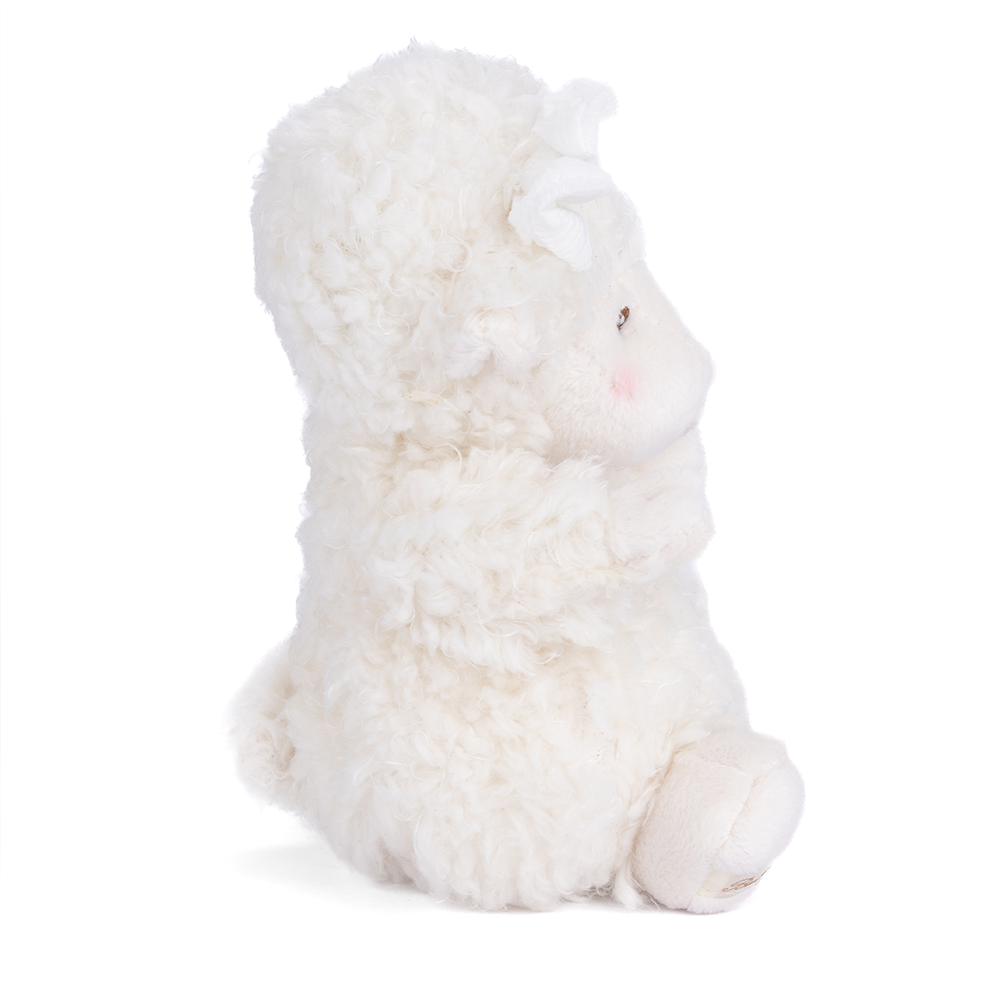 Baby Molly, a plush little lamb with soft white fleece that beckons for cozy cuddles and warm embraces. Adorned with a cute hair bow, she captures the essence of playful elegance. Her pink stitched nose and gentle brown eyes radiate a comforting warmth, inviting endless moments of love and storytelling. Crafted with care, Baby Molly is a timeless treasure, ready to become a beloved part of your family and create cherished memories.