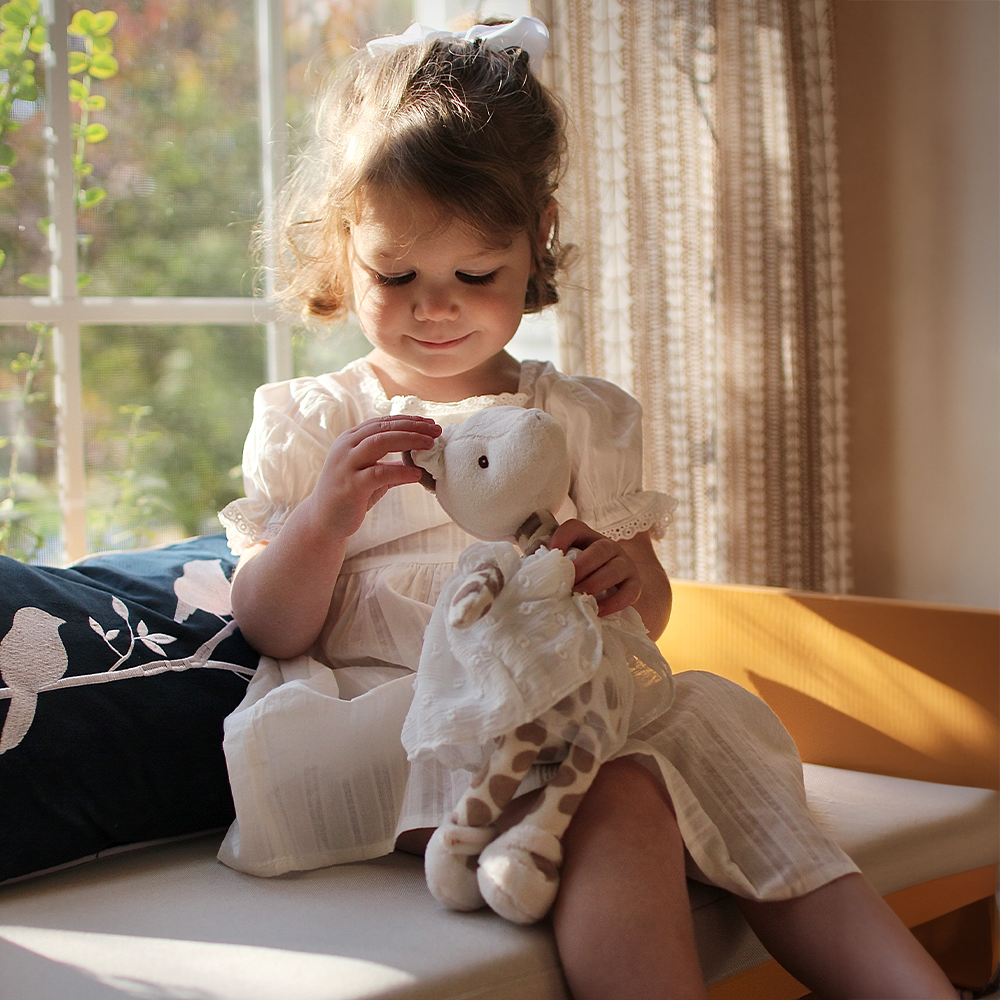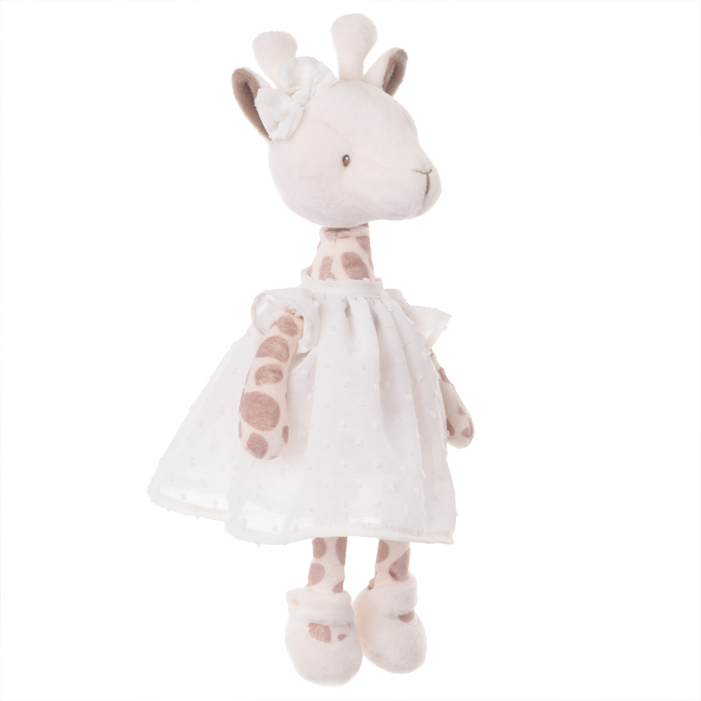 Lucy is the only giraffe among her friends, making her a favorite! The little ones love her for her long neck since she helps them grab things that are out of reach. She is dressed in a cute white dress and has stitched eyes, making her great for infants.