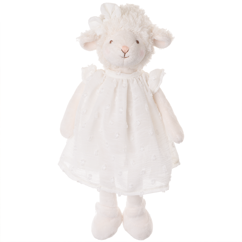 Molly, the newest lamb in the Bukowski Bears family, radiating warmth and charm with her soft white fleece. Dressed in an elegant white bow, a matching dress, and shoes, she showcases timeless beauty. Her gentle features are highlighted by a pink stitched nose and expressive brown stitched eyes, inviting stories and snuggles.